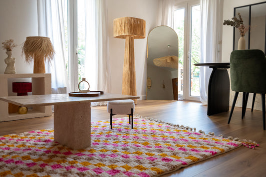 Nos produits, tels que les tapis berbères, miroirs, luminaires et vannerie, poterie, mobilier d'intérieur et d'extérieur, incarnent la fusion harmonieuse entre l'artisanat traditionnel marocain et nos idées créatives contemporaines.