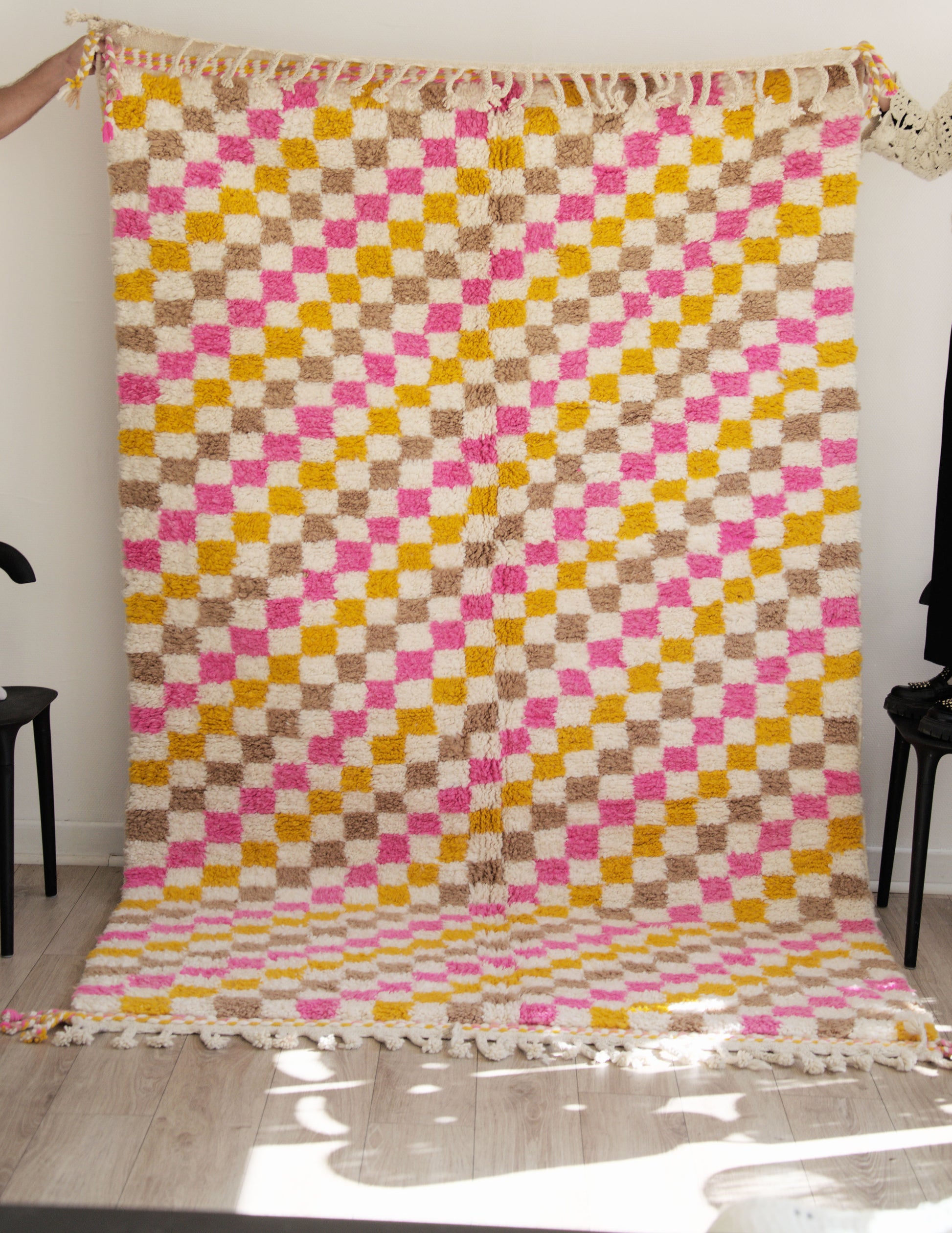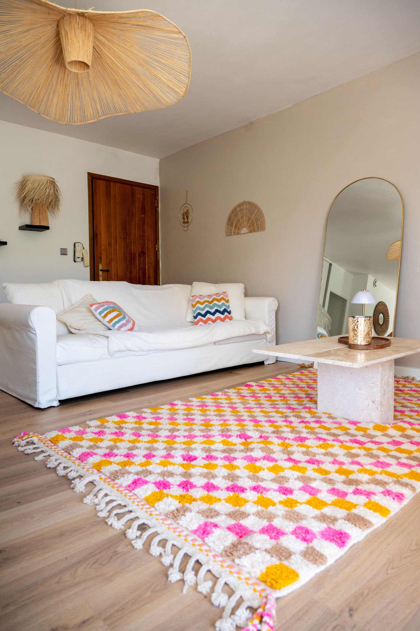 Fabriquée à la main dans les provinces de Marrakech, pure laine de mouton, la particularité de ces tapis et le savoir-faire : un tissage très serré pour un rendu dense et de haute qualité. Tapis issu d’un savoir-faire ancestral de nos artisans et de leurs traditions.