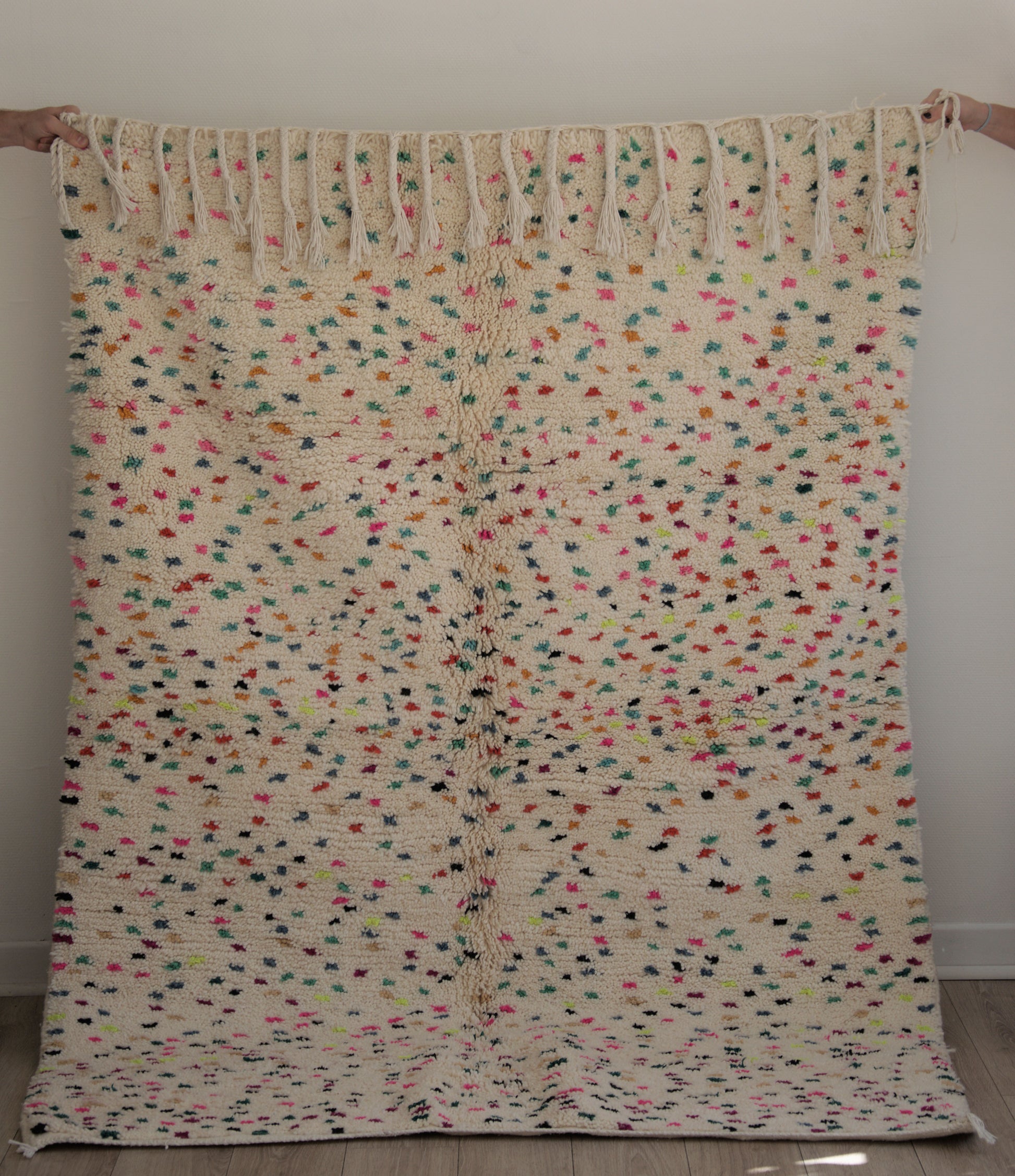 Fabriquée à la main dans les provinces de Marrakech, pure laine de mouton, la particularité de ces tapis et le savoir-faire : un tissage très serré pour un rendu dense et de haute qualité. Tapis issu d’un savoir-faire ancestral de nos artisans et de leurs traditions.